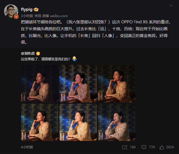 博主flypig转发了刘作虎的微博:“把猜谜环节留给各位吧。(我六张里能认对四张?)这次OPPO Find X6系列的重点,在于长焦镜头画质的巨大提升。过去长焦比「远」,十倍,百倍;现在终于开始比画质,比暗光,比人像。让手机的「长焦」回归「人像」,变回真正的黄金焦段。好得很。”