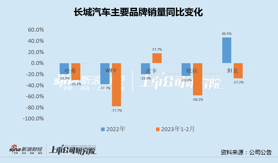 而乘联会发布的车厂零售数据则显示,1-2月长城汽车销量同比下降达47%,位列各主要车企最末,零售端销量惨遭腰斩。