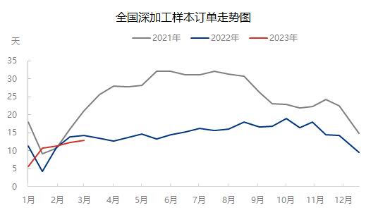 从下游深加工订单情况看,据隆众资讯统计,截至2023年3月中旬,深加工企业订单天数12.9天,较2月同期增加1.5天,环比涨幅13.16%。从近期行业的调研情况来看,订单同期相比不如往年,下游贸易商的回款也遇到一些问题,玻璃深加工企业回款状况不佳,承接没有回款保障的订单意愿不强,在手订单量处于偏低水平,补充玻璃原片库存的意愿尚待恢复。