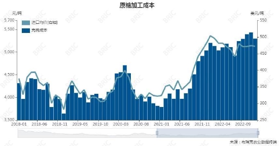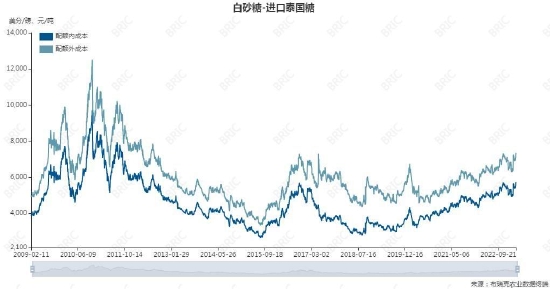 国产糖量占新榨季供给接近65%,本榨季国产糖产糖率下降导致成本有所提升。国产糖成本均在5400元/吨附近,目前销售价在6300元/吨附近,有较好的利润。配额外进口糖作为供应占比15%的糖源,目前进口成本已经超过国内现货价格。原糖加工成本处于历史高位,进口利润减少。白糖和淀粉糖价差拉大。