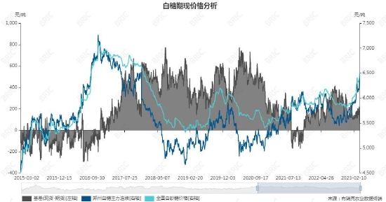 1、影响因素:近期巴西和泰国天气传出不如预期,产量比前期预估有所减少。印度限制白糖出口。欧佩克下半年减产原油,导致原油供应减少,部分国家糖制乙醇比例增加,挤压白糖产能。消费端全球疫情结束,消费回暖。供需基本面未来一年度略微过剩,总体维持紧平衡。国内新榨季销售利好,消费增加,现货价格不断走高。国内3月份经济回暖,消费旺季到来,价格偏强。