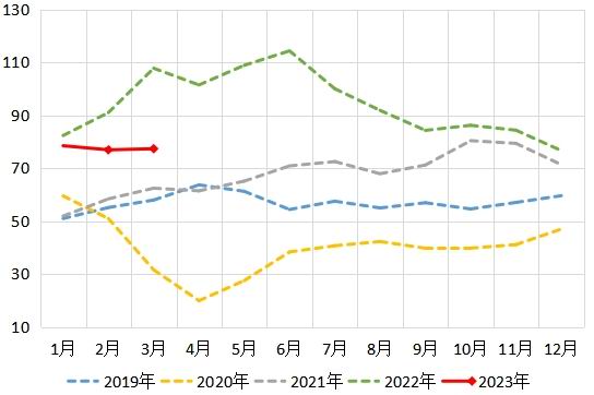 饲料盈利上涨提振饲料需求。随着饲料原料成本逐渐走低,饲料企业库存可用天数趋势增加,当前建库量偏低,库存可用天数维持近三年同期最低位,截至3月24日,全国饲料企业玉米平均库存为31.94天,环比增加了5.94%,较去年同期的39.08天减少了18.27%,其中,华北地区和华东地区库存可用天数均不足30天。目前禽类饲料预期盈利维持高位,猪饲料利润逐渐修复,饲料需求仍有较大上涨空间。