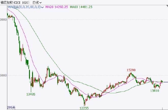 棉花价格底部反弹,中长期走势震荡上行。短期关注金三银四消费旺季情况。主力合约09价格在14000附近支撑明显,可能维持在14000-15000区间震荡。