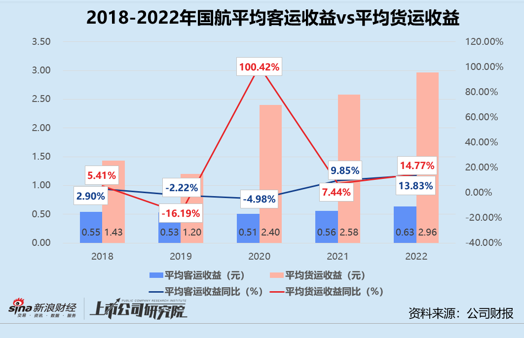 运输周转量、运力经营效率表现堪忧,国航的平均客运收益和平均货运收益却在三大航司中排名第一。2022年平均客运收益增长13.83%至0.63元,港澳台航线每收费客公里收益较2021年激增47.05%;2022年每收入货运吨公里收益逼近3元,港澳台航线平均货运收益由2021年的7.79元提升至9.12元。