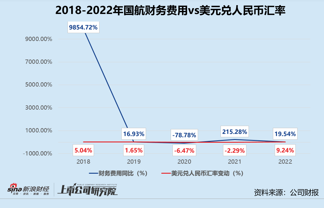 费用管控方面,报告期内国航的销售费用同比大幅下调20.70%,管理费用较2021年小幅增长6.67%。财务费用同比增加62.08亿元,15.75%由利息支出(不含资本化部分)贡献,40.89亿元汇兑净损失占财务费用新增总额65.87%。