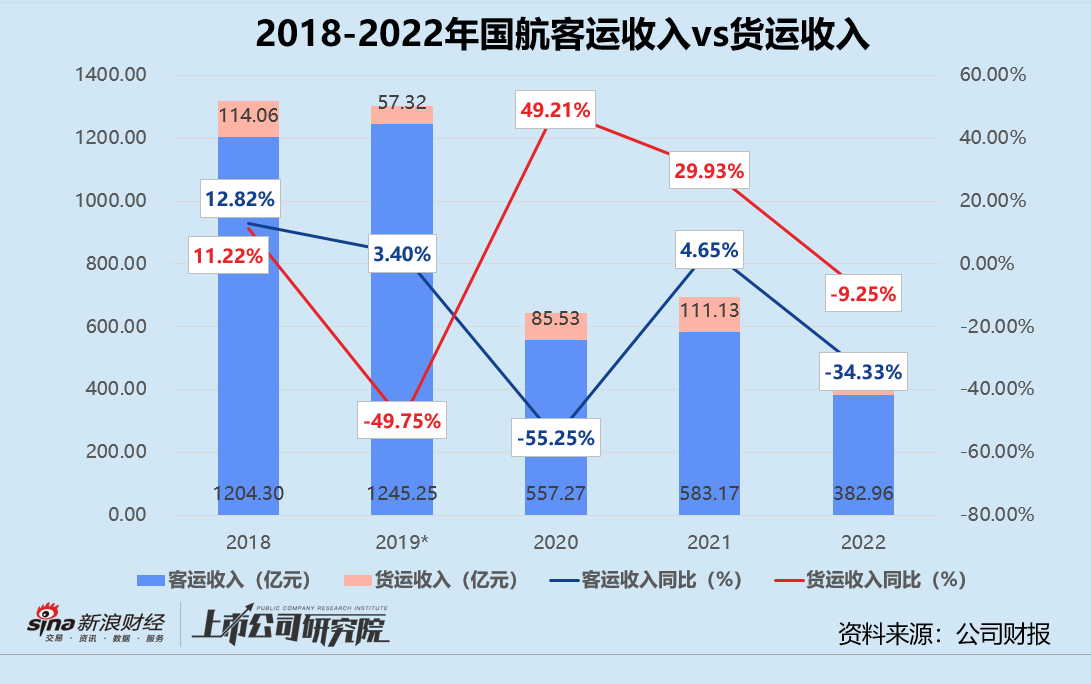 结合过去五年的数据来看,自2019年起旗下的货运子公司国货航剥离,国航的货运统计口径不再包括全货机货运数据,当期货运收入同比骤减49.75%。疫情爆发后,国航自身的货运收入保持高速增长。货运收入对总营收的贡献比例由2019年的4.21%提升至19.06%,客运收入占比则由超91%降至2022年的72.40%。