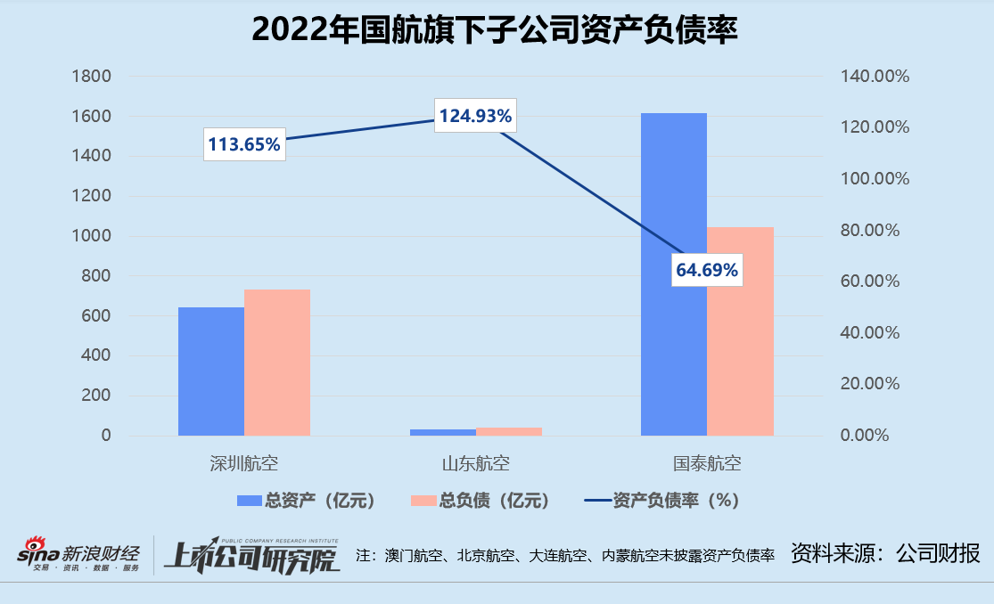同样资不抵债的还有山东航空,2022年的资产负债率高达124.93%。据公告显示,山东航空因连续两年期末净资产为负值,面临强制退市窘境。国航通过受让山钢金控、青岛企发注册资本及增资66亿元获得山东航空共计66.8%股权,预计将继续以每股2.62港元价格收购B股市场上1.4亿股流通股份,终止山东航空的上市地位。