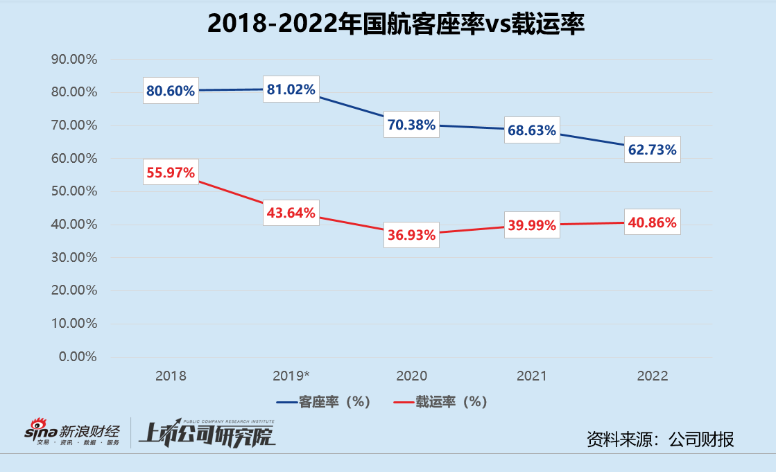 运营效率指标层面,2022年国航的客座率仅为62.73%,与2021年同期相比减少近6个百分点,在三大航司中表现垫底。国内旅客周转量和港澳台航线旅客周转量分别下滑43.29%、39.78%,而同期国内和港澳台航线客运运力投入分别缩减38.37%、30.95%,运力过剩情况普遍存在;货邮载运率同比微增0.87个百分点达40.86%,已是近3年以来的最高点,但仍较2019年下降2.77%。