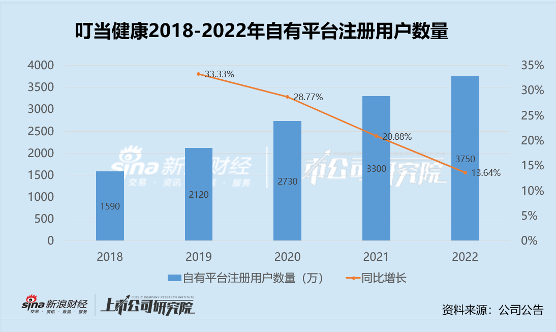 需要注意的是,特别是2022年以来,叮当健康似乎进入了用户增长近乎停滞的僵局。公告显示截至2022年一季度自有平台注册用户数量为3390万,而2022年底也仅为3750万,时隔9个月仅实现了不到400万用户的增长。