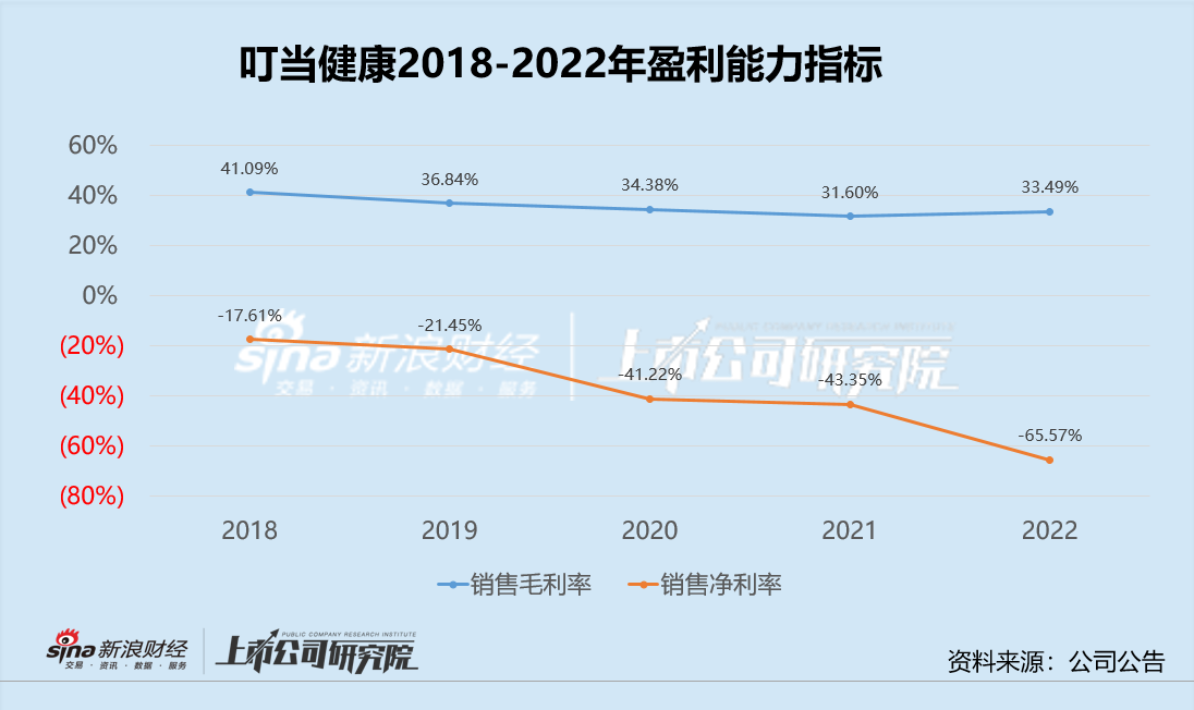 而在盈利能力指标方面,可以看到,叮当健康的销售毛利率略高于京东健康、阿里健康(为20%左右)。但与后两者在2022年实现扭亏为盈不同,叮当健康的销售净利率始终为负,且有不断加深的趋势,2018-2022年,叮当健康的销售净利率分别为-17.61%、-21.45%、-41.22%、-43.35%与-65.57%。