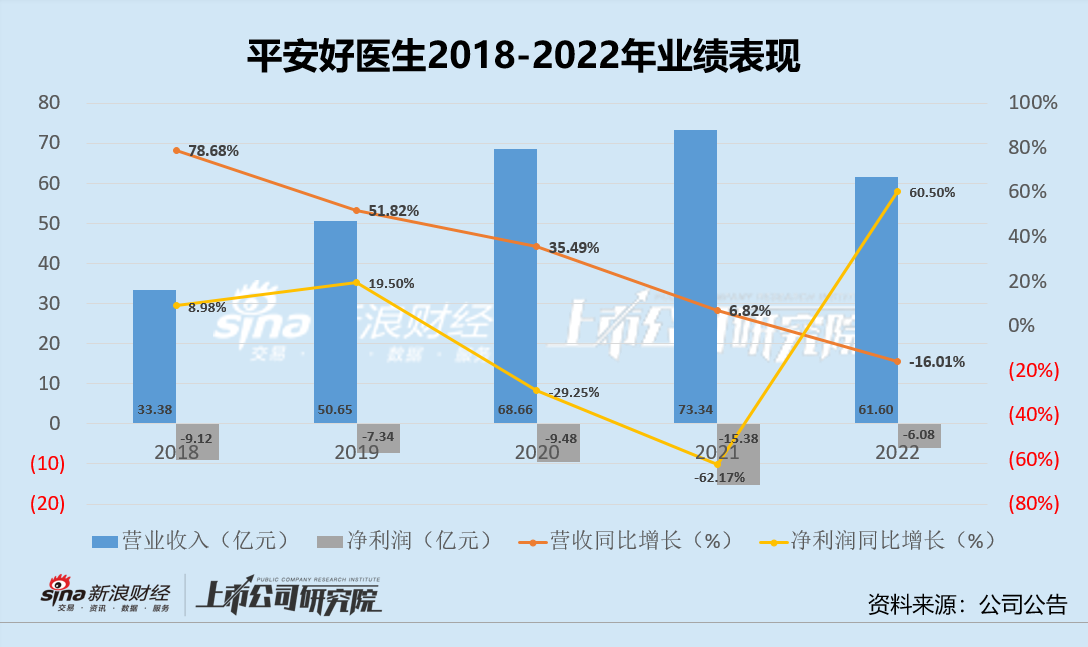 2022年,平安好医生出现了上市以来首次营收规模缩减的问题。报告期内,平安好医生实现营业收入61.60亿元,同比减少16.60%。