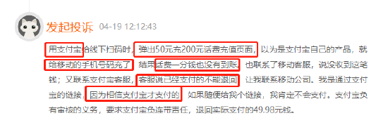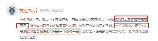 近期,有用户在黑猫平台反馈在使用支付宝时弹出50元充200元话费充值页面,用户通过链接充值后话费并未到账,并且原本填写自己的号码却变成别人的手机号,在咨询支付宝客服后,客服表示不止一人反应这类问题,但当时的账户仍可交易。