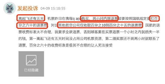 近日,有消费者通过黑猫投诉【投诉入口】平台反馈,自己订购机票后两小时内想退票,此时距起飞时间还有5天,国航要扣取60%退票费。