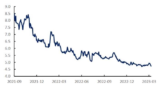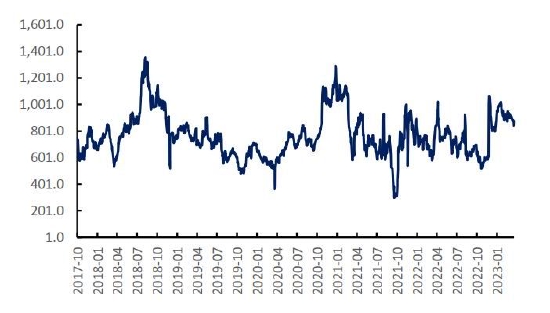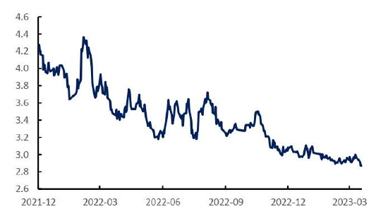 2022年需求端与成本端的至暗时刻已经过去,2023年二季度或将延续“重基建、轻地产”。表观消费方面,3月螺纹周均表观消费为334.4万吨,同比增加31.334万吨,同比上升10.34%;3月末螺纹表需333.21万吨,环比增加10.78万吨。从建材日成交来看,上半月成交水平较火热,下半月相对较差。两会结束后的获利盘兑现意愿较强,而海外硅谷银行的风险事件暴露,使得贸易商投机需求进一步减弱,市场情绪普遍谨慎。预计未来在稳增长相关政策的驱动下,基建将继续充当需求的主力军,同时,二季度更需关注钢厂利润情况。