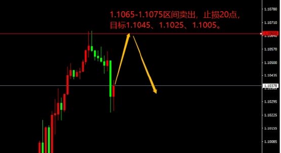 1.1065-1.1075区间卖出,止损20点,目标1.1045、1.1025、1.1005。