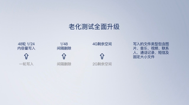 相比老化测试1.0,久用流畅测试对“老化过程”进行了调整,由原有的一次性老化升级为48次老化,同时老化流程中保留的剩余空间由2GB增至4GB。与此同时,在老化APP用例上也根据用户真实调研结果的变化进行了替换更新。