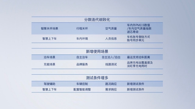 在原有的“新能源汽车智能化评测标准1.0”基础上,鲁大师对整体的智能化评分机制进行了完善,增添了更加丰富多样的评测需求,比如:新增了近40项细分功能打分体现,新增了代客泊车智能化测评、环境温度自适应表现等使用场景,针对部分车辆功能新增了一部分测试条件等。