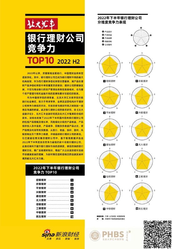 近日,《北大金融评论》、北大汇丰金融研究院及北大汇丰智库联合发布北大汇丰·银行理财公司竞争力(2022年下半年)排名。在已披露信息完备的理财公司中,基于客观数据评选出2022年下半年度综合竞争力排名和单项排名前10名银行理财公司,录得结果如下。