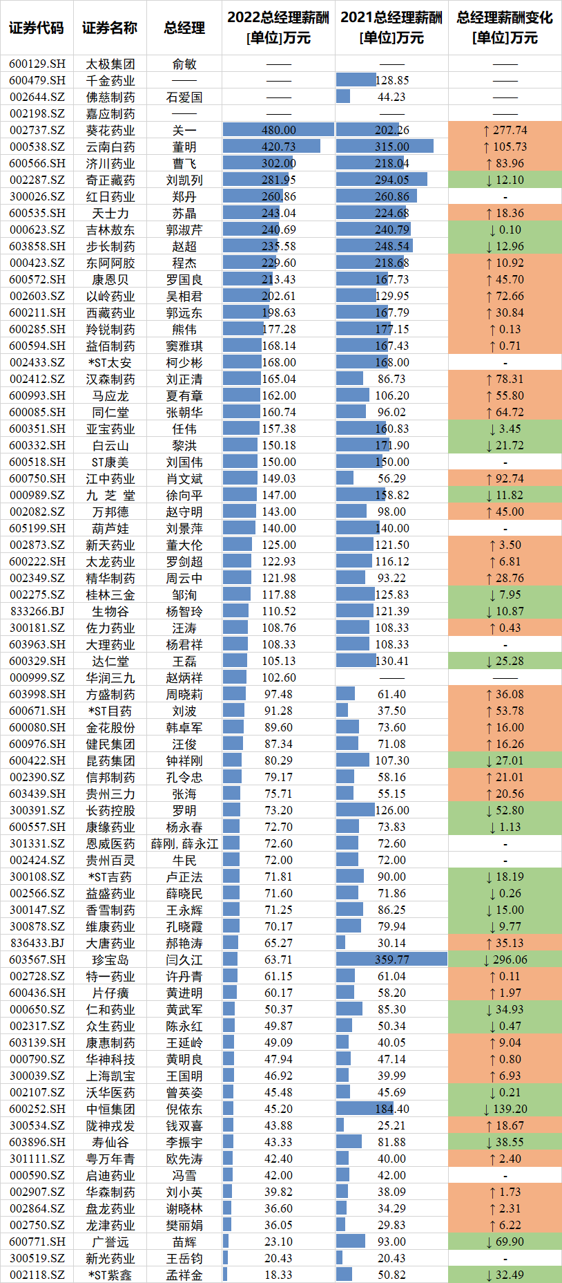 董事长薪酬:云南白药董明年薪惊天降幅869.24万元,济川药业曹龙祥年薪375万元行业最高
