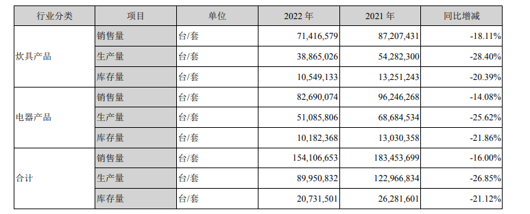 销售额减少的背后是苏泊尔的产品生产量、销售量与库存量全部下滑。2022年,苏泊尔的炊具产品生产量同比减少28.40%,销售量同比减少18.11%,电器产品生产量同比减少25.62%,销售量同比减少14.08%。
