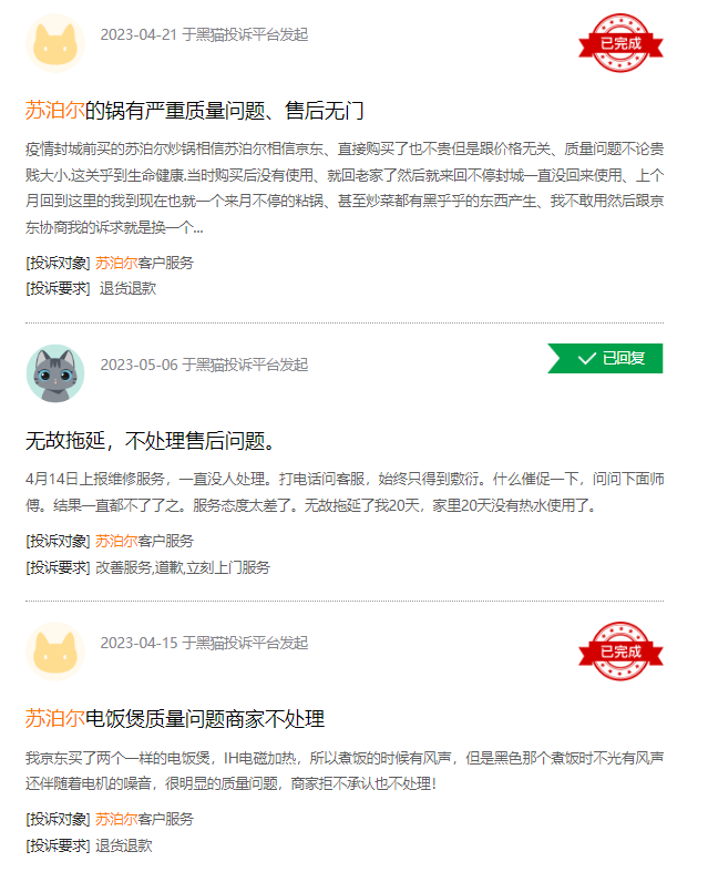 在黑猫投诉【投诉入口】上,对于苏泊尔的投诉量高达一千五百余条,其中大多投诉直指质量差、售后无门等问题。