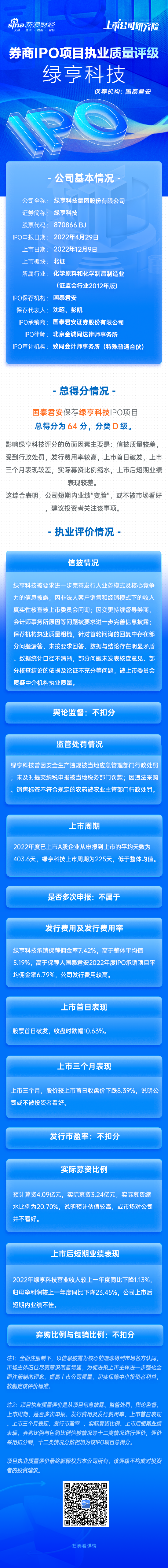 绿亨科技IPO项目总得分为64分,分类D级。影响绿亨科技评分的负面因素主要是:信披质量较差,受到行政处罚,发行费用率较高,上市首日破发,上市三个月表现较差,实际募资比例缩水,上市后短期业绩表现较差。这综合表明,公司短期内业绩“变脸”,或不被市场看好,建议投资者关注该事项。