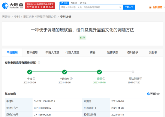 【#李书福发明便携调酒专利# #吉利控股集团便携调酒专利获授权#】天眼查App显示,7月18日,浙江吉利控股集团有限公司申请的“一种便于调酒的原浆酒、组件及提升品酒文化的调酒方法”专利获授权。值得一提的是,该专利发明人为李书福。