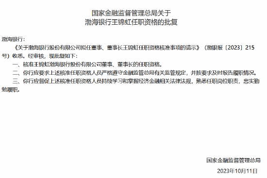 10月13日金融一线消息,国家金融监督管理总局今日公开《国家金融监督管理总局关于渤海银行王锦虹任职资格的批复》。批复显示,国家金融监督管理总局已于10月11日核准王锦虹渤海银行股份有限公司董事、董事长的任职资格。