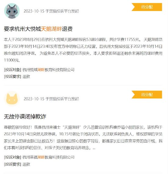 5D调查在黑猫投诉【投诉入口】搜索发现,近期也出现多起对“天鹅湖畔少儿芭蕾”的投诉。有家长表示,于今年8月29日在杭州大悦城天鹅湖畔报名53课时课程,共计学费11755元,但是该校区于10月14日晚也通知闭店停课。还有家长称杭州来福士门店10月14日突然无故停课,10月15号就处于闭店状态,且无法联系到负责人,维权群里的学员家长未上的课金额已达数百万。