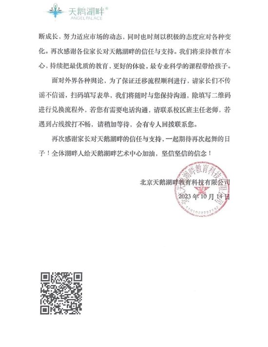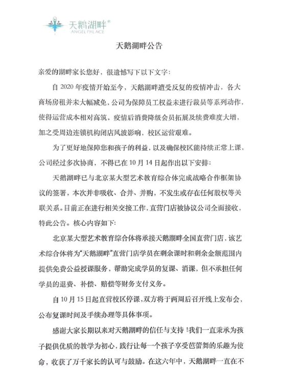 10月14日,“天鹅湖畔少儿芭蕾”发布公告称,已与北京市某大型艺术教育综合体进行交接,该艺术综合体将为“天鹅湖畔”直营门店学员在剩余课时和剩余金额范围内提供免费公益授课服务,帮助完成学员的复课、消课,但不承担任何学员的退费、补偿、赔偿等财务支付义务。“自10月15日起直营校区停课,双方将于两周后召开线上发布会公布复课时间及手续办理等具体事项。”