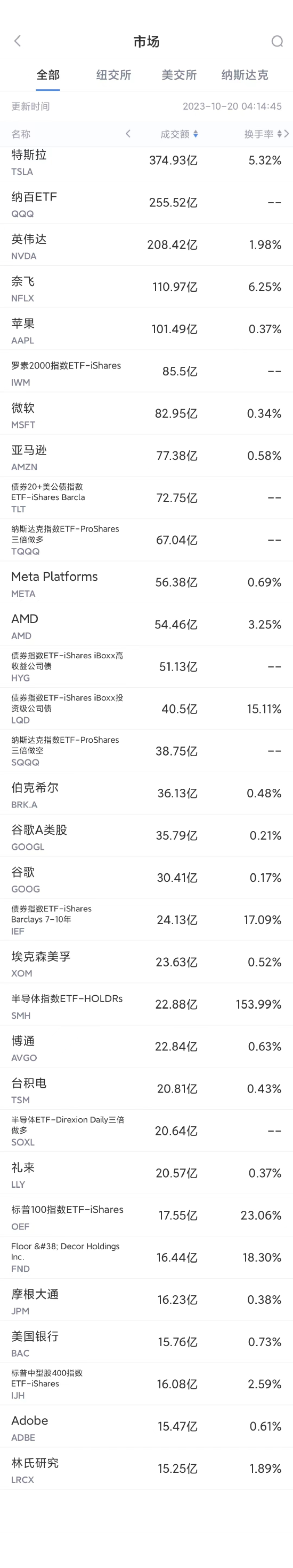 以下为美股当日交易最活跃的20只股票(按成交额):