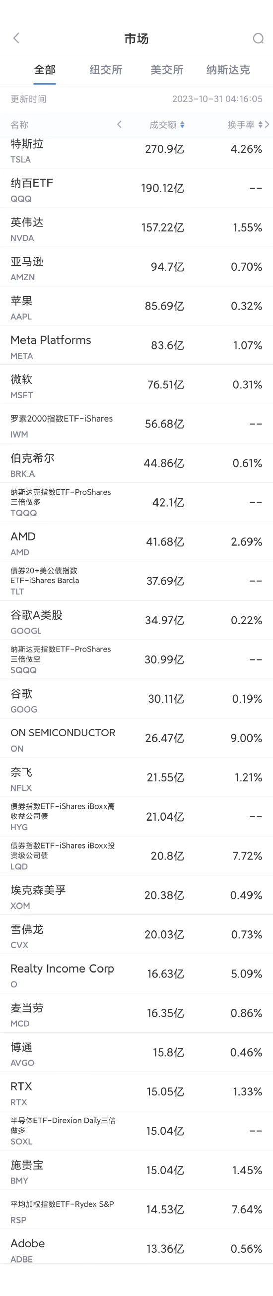 周一美股成交额第1名特斯拉收跌4.81%,股价跌破200美元,创5月底以来最低收盘价,成交270.9亿美元。特斯拉电池供应商松下公司周一发布财报称,北美市场对高端电动汽车的需求正在放缓,该公司因此下调其为特斯拉等汽车制造商生产电池的能源部门的业绩指引,预计该部门本财年营业利润将下降15%。