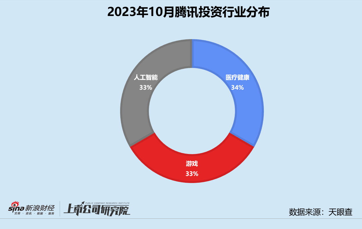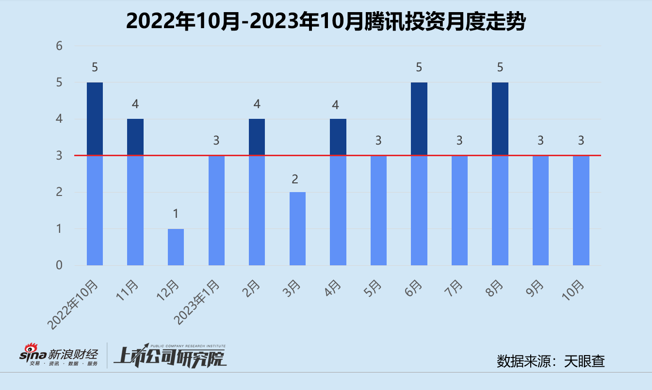 统计区间内,腾讯投资公开披露的股权投资事件共3起,与2022年10月相比锐减40%。就往期数据而言,平台的月均投资数量保持在3-5起之间,2023年整体相对平稳。不过,与投资高峰期2020年(181起)-2021年(294起)相比,2022-2023年腾讯的投资节奏明显放缓。