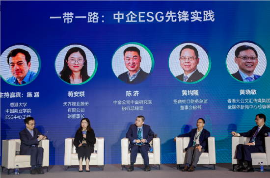 在“一带一路:中企ESG先锋实践”的平行论坛中,香港大学中国商业学院ESG中心主任、亚洲开发银行价值链与循环经济国际顾问施涵,天齐锂业股份有限公司副董事长蒋安琪,中金公司中金研究院执行总经理陈济,招商蛇口财务总监、董事会秘书黄均隆,香港大公文汇传媒集团全媒体新闻中心总编辑黄晓敏围绕“一带一路”ESG探索展开讨论。