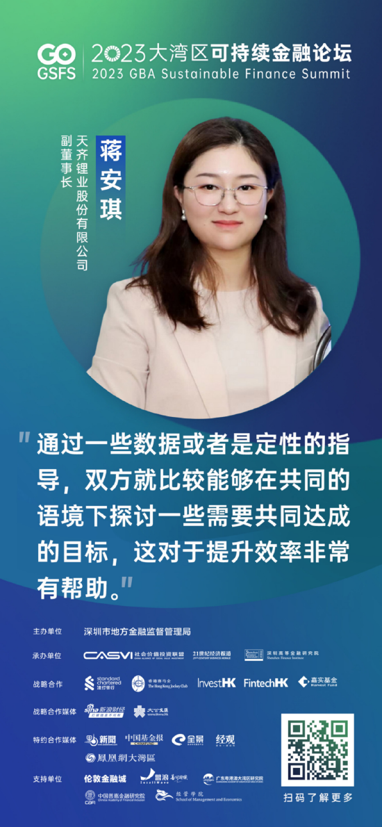 作为一家较早将ESG作为重要战略的企业,天齐锂业股份有限公司副董事长蒋安琪表示,将ESG相关工作置于高位,也是和企业的发展历程有一定联系,“我们从一个比较小的民营企业,发展为A+H股的上市企业,到如今作为国际锂行业的一个比较重要的参与方。我们很早就认识到如果要国际化的话,必须要去寻找一种共同的语境。”