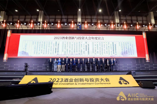 全体大会最后,中国贵州茅台酒厂(集团)有限责任公司总经理助理钟方达,宜宾五粮液股份有限公司党委委员、副董事长张宇汾酒集团党委专职副书记、副董事长李振寰,泸州老窖股份有限公司副总经理、首席质量官何诚,陕西西凤酒股份有限公司总经理张周虎,四川全兴酒业有限公司常务副总经理徐向阳,亳州古井销售有限公司副总经理罗天祥,贵州董酒股份有限公司党委副书记王莉萍,珍酒李渡集团董事会主席、华致酒行董事长吴向东,AIIC酒业创新与投资大会发起人、云酒传媒创始人秦书尧,著名酿酒专家、江南大学教授、博士生导师徐岩,华润雪花啤酒(中国)有限公司董事长兼总经理侯孝海,复星国际副总裁、豫园股份联席董事长石琨,江小白创始人陶石泉,智海王潮传播集团联合创始人兼总裁谌立雄,OCD甲古文创意创始人兼首席创意官刘文等AIIC酒业创新与投资大会特邀联合发起人,共同登台,发布《2023酒业年度宣言》,就“变局是加快酒业升级、实现高质量发展的战略性机遇”达成共识,承诺“以科学推动绿色发展水平提升,实现价值突破”“通过文化传续与创新,增强消费活力,实现市场新生”。