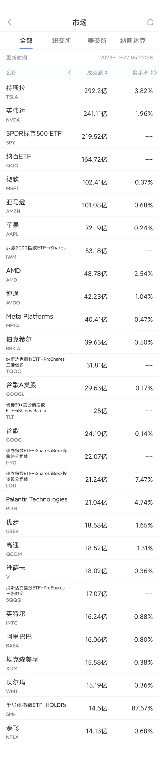 第16名英特尔收跌2.46%,成交16.24亿美元。据报道,英特尔明年将推出Lunar Lake,或将委托台积电量产,打破过往英特尔CPU芯片从来没有委外生产的传统。台积电明年将会手握英特尔Lunar Lake的CPU、GPU及高速IO芯片订单,并会采用台积电N3B制程量产,预计将会在明年上半年开始投片量产。