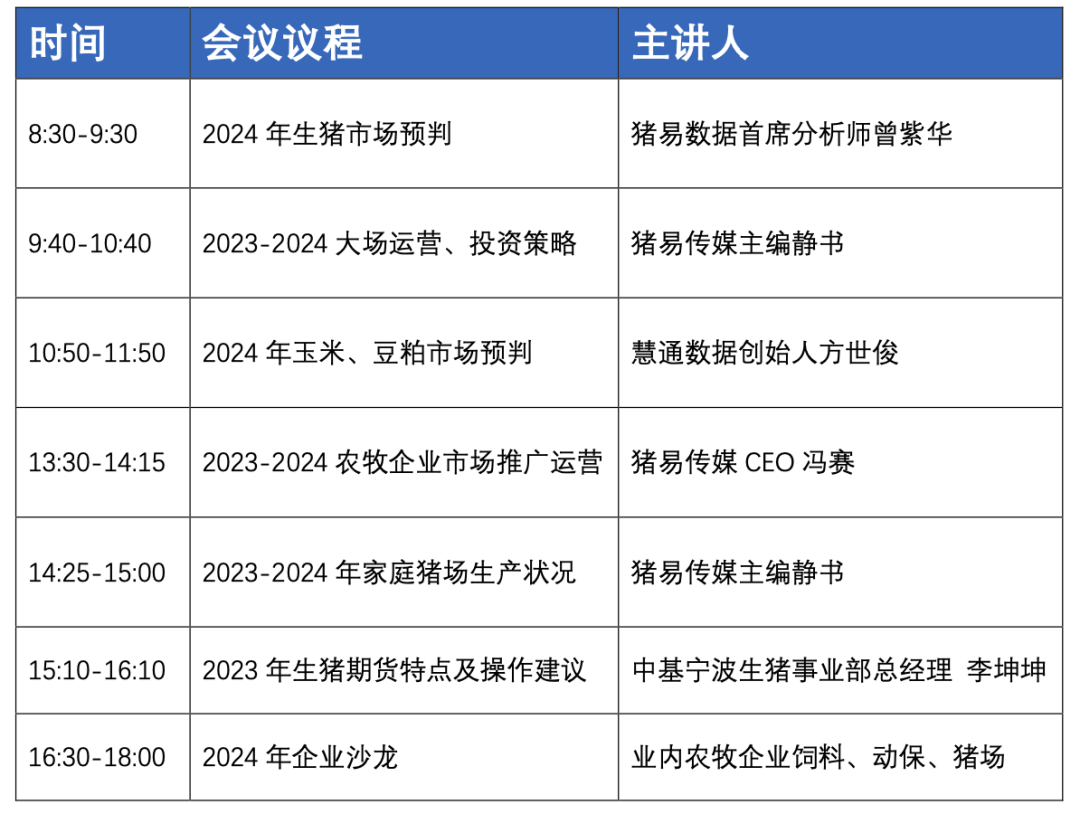 为助力农牧企业做好 2024 年经营规划,打有准备之仗,猪易将于 11 月26 日在河南郑州举办“2024 生猪产业高层研讨会”,呈现当下家庭猪场生产发展情况,分析农牧企业运营投资战略,剖析生猪、屠企、食品端链条问题,预判 2024 年生猪产业新特点,让农牧企业 2024 年业务规划有参考,更实际,做到不盲从,精准服务客户;知进退,谋求长远利益,打好2024 这场仗!