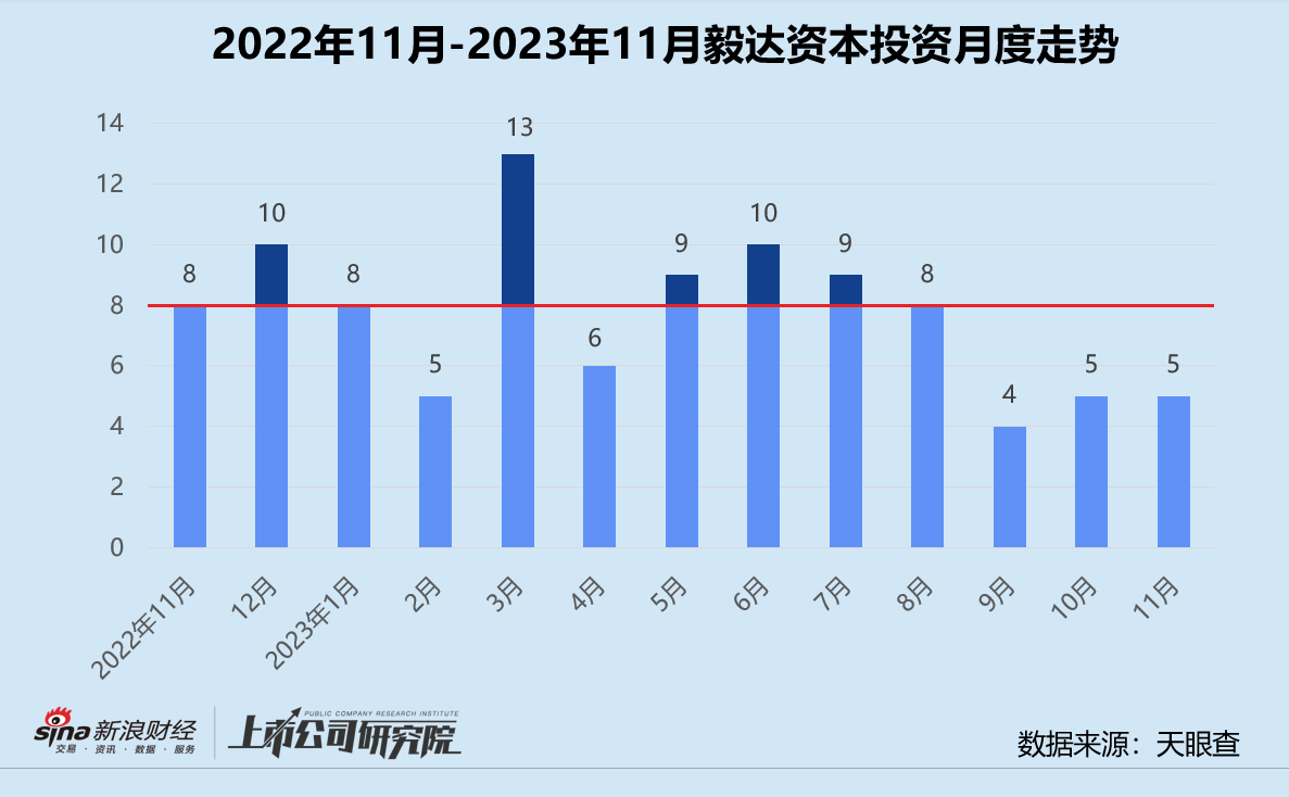 统计区间内,毅达资本公开披露的股权投资事件共5起,与10月投资频率持平,较2022年11月同期下降37.50%。往期数据显示,2022年11月至2023年8月期间,毅达资本的投资节奏都相对稳定,基本保持在平均水平以上。但9月以后,毅达资本投资频率走低,表现普遍不及2022年同期。