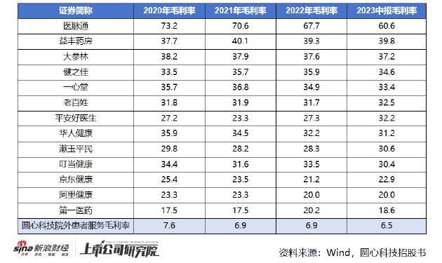 由此可见,圆心科技卖药业务采取的是低价换量策略,利润空间十分有限,这一点从公司持续降低的主营业务毛利率同样有所体现。从业务类型看,“院外患者服务”,即通过线上线下渠道向患者出售药品的服务营收占据公司总营收的比例基本维持在95%左右,而该项业务在报告期内毛利率持续降低,分别为7.6%、6.9%、6.9%和6.5%,远低于其他药店行业企业平均水平。