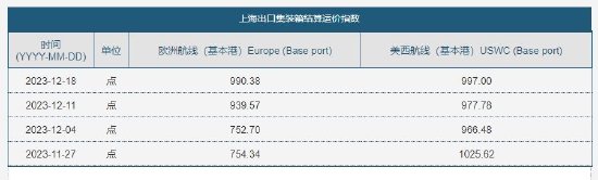 根据设计条款,查阅上海航运交易所“SCFIS”编列规则可以发现,该指数价格指数每周一15:05公布,最新一期还是12月18日,价格990.38点。