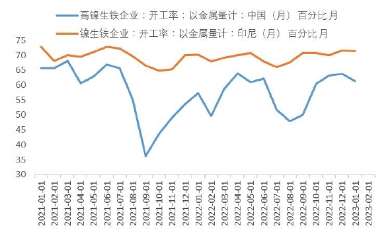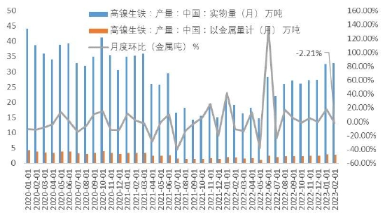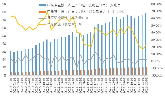 镍铁方面,1月份国内镍铁产量环比增加了17.87%,2月份环比略有下降2.21%,但整体实物量产量也达到了32.84万吨的高水。这两个月的高产量均创下了2021年3月以来的高点。此外,印尼方面的产量也不容小觑。2月份,印尼月度产量(实物量)达到78.14万吨,环比增加2.38%,同比增加23.02%。金属量也达到了10.62万吨,远高于我国2.81万金属吨水平。尽管由于缺乏进出口数据,但依据以往我国进口占比,预计自印尼的镍铁进口量应都在55万吨(实物量)以上,同比增速都在80%的高增速阶段。大量的印尼镍铁供给带给国内市场较大冲击。