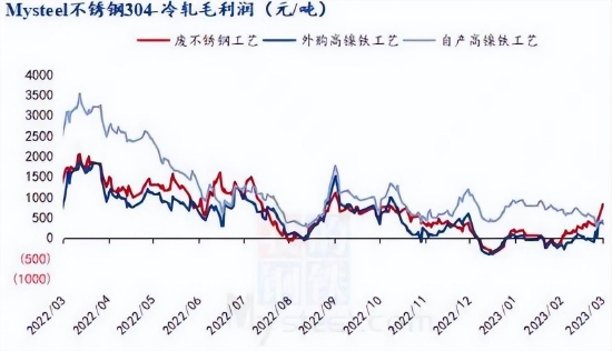 终端不锈钢方面的库存主要是累库阶段时间较长,导致库存高位时间长。不过进入3月以后已经开始出现去库迹象。MYSTEEEL数据显示,截至3月10日,300系冷轧不锈钢社会库存(佛山+无锡)49.90万吨,已经出现周环比连续下降2周情况。在螺纹钢等黑色品种受终端走好的背景下,300系不锈钢有其不同于其他黑色属性的特点,终端用途较为分散,且是地产行业的后端产业部分,而环保投资、餐饮投资等尚未明显启动的情况下,300系冷轧的终端需求恢复较慢。