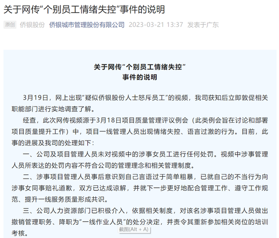 《说明》称,3月19日,网上出现“疑似侨银股份人士怒斥员工”的视频,公司获知后立即敦促相关职能部门进行实地调查了解。经查,此次网传视频源于3月18日项目质量管理评议例会(此类例会旨在讨论和部署项目质量提升工作)中,项目一线管理人员出现情绪失控、语言过激的行为。目前,此事的进展及公司的处理如下。