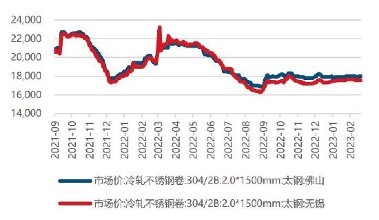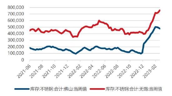 2月不锈钢价格偏弱运行。供应端,节后不锈钢厂复工状况好于去年同期,但随着不锈钢生产利润的下滑,不锈钢厂生产动力有所减弱。需求端,终端需求回暖程度不及预期,叠加社会库存高位消库进度缓慢,2月不锈钢生产利润仍然承压。Mysteel数据显示,截止2023年2月23日,全国主流市场不锈钢55仓库口径社会总库存119.5万吨,环比上升1.95,其中300库存76.3万吨,环比增加1.14%。目前不锈钢产业主要矛盾聚焦于需求端的消库进度,后市关注两会地产方面政策的走向对行情的边际影响。