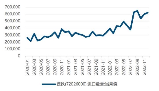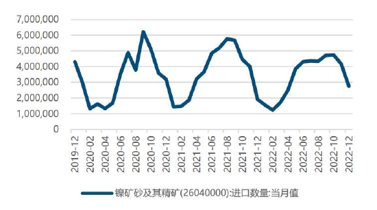 进口方面,海关数据显示,2022年12月中国进口镍铁总量61.99万吨,,环比增加2.28万吨、增长3.81%,同比增加28.39万吨、增长84.5%。当前海关尚未公布1月镍铁进口数据,受春节影响,进口量或出现小幅下滑,但将在2月进口中显现更明显增量。产量方面,据SMM数据,2023年1月全国镍生铁产量为3.6万镍吨,环比增长2.47%,同比增长13.75%。分品位看,1月高镍生铁产量约3.08万镍吨,低镍生铁产量为0.53万镍吨。