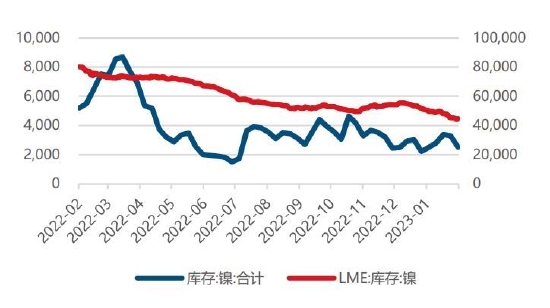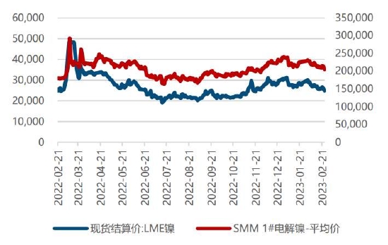 2月电解镍价格偏弱运行。供应方面,SMM数据显示,2023年1月全国电解镍产量共计1.64万吨,同比上升37.24%。随着纯镍现货进口窗口重启,叠加电积镍产线逐步完成调试,纯镍稀缺担忧逐渐缓解。此外,多家媒体报道华友钴业总经理将前往LME,或进一步解决纯镍交割品稀缺问题。需求方面,节后复苏程度不及预期,下游不锈钢需求偏弱,负反馈向上传导,也给镍价带来压力。而新能源汽车端受去年提前消费影响,短期需求增速也显著放缓。库存方面,纯镍社会库存处于历史地位,但在需求羸弱的背景下,随着纯镍供应量增多,2月纯镍库存量有所上升。SMM数据显示,截至2月24日,镍库存总计为2514吨,较1月末上涨13.04%。