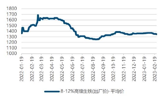 2月镍铁价格下跌,SMM数据显示,截至2023年2月24日,高镍生铁均价1345元/镍,较1月初下降25元/镍。