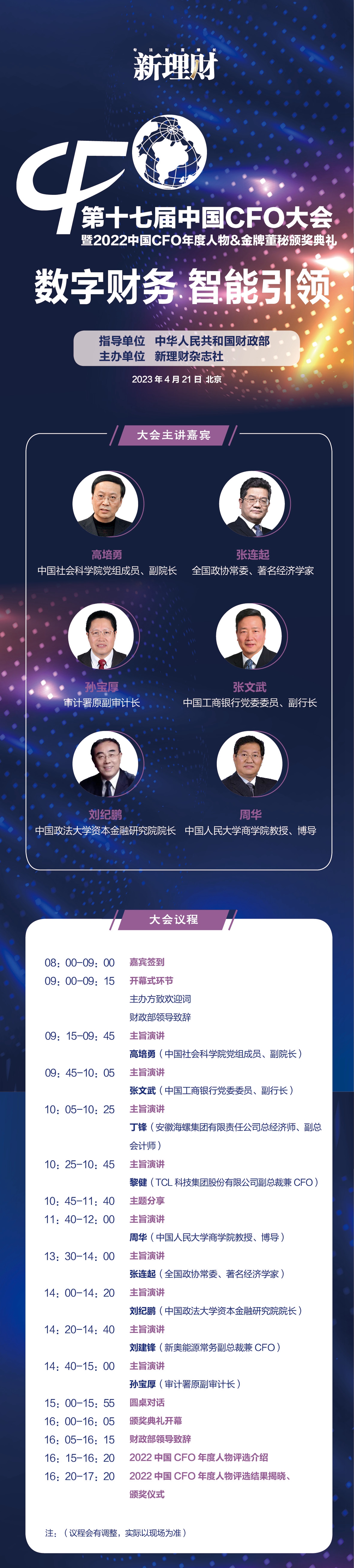数字化时代,企业CFO们应该以怎样的崭新姿态面对这个时代的挑战,并肩负起新的历史使命和责任,我们期待听到您的声音,并将这些声音汇聚成引领中国财务变革的中坚力量。基于此,新理财杂志社决定于2023年4月21日举办第十七届中国CFO大会,本届大会聚焦“数字财务 智能引领”这一主题,届时,将有来自全国政界、企业界、学术界的专家学者共同演绎CFO领域的顶尖峰会,还将见证“2022中国CFO年度人物和金牌董秘”的加冕。