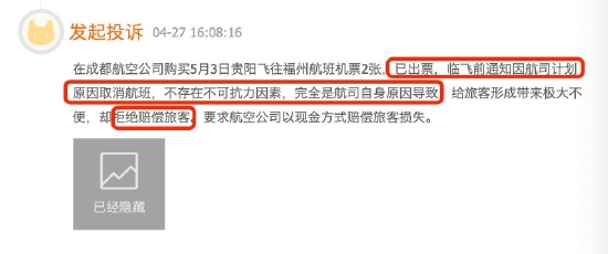 近期,有消费者通过黑猫投诉【投诉入口】平台反馈,自己购买的成都航空机票已出票,航司临飞前通知因自身计划原因航班取消,不存在不可抗力因素,给旅客带来极大不便,却拒绝赔偿旅客。